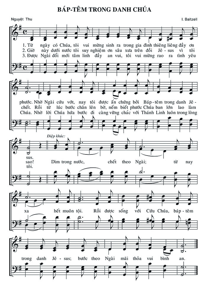1. Từ ngày có Chúa, tôi vui mừng sinh ra trong gia đình thiêng liêng đầy ơn phước. Nhờ Ngài cứu vớt, nay tôi được ấn chứng bởi Báp-têm trong danh Jê-sus. Rồi từ lúc bước chân lên bờ, nếm biết phước Chúa ban lớn lao làm Chúa. Nhờ lời Chúa hứa bước đi càng vững chắc với Thánh Linh luôn trong lòng. 2. Giờ này dưới nước tôi suy nghiệm ơn sâu xưa trên đồi Jê-sus vì tôi chết. Rồi từ lúc bước chân lên bờ, nếm biết phước Chúa ban lớn lao làm Chúa. Nhờ lời Chúa hứa bước đi càng vững chắc với Thánh Linh luôn trong lòng. 3. Được Ngài đổi mới tâm linh đầy an vui, tôi vui mừng rao ra tình yêu phước. Nhờ Ngài cứu vớt, nay tôi được ấn chứng bởi Báp-têm trong danh Jê-sus. Rồi từ lúc bước chân lên bờ, nếm biết phước Chúa ban lớn lao làm Chúa. Nhờ lời Chúa hứa bước đi càng vững chắc với Thánh Linh luôn trong lòng. Điệp khúc: sus. Dìm trong nước, chết theo Ngài; từ nay sao! tôi. xa hết muôn tội. Rồi được sống với Cứu Chúa, báp-têm trong danh Jê-sus; bước theo Ngài mãi thỏa vui bình an.