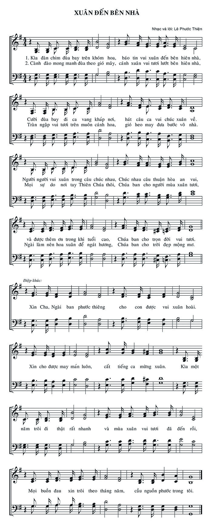 1. Kìa đàn chim đùa bay trên khóm hoa, báo tin vui xuân đến bên hiên nhà, Cười đùa bay đi ca vang khắp nơi, hát câu ca vui chúc xuân về. Người người vui xuân trong câu chúc nhau, Chúc nhau câu thuận hòa an vui, và được thêm ơn trong khi tuổi cao, Chúa ban cho trọn đời vui tươi. Một năm trôi đi thật rất nhanh và mùa xuân vui tươi đã đến rồi, Mọi buồn đau xin trôi theo tháng năm, cầu nguồn phước trong tôi. 2. Cành đào mong manh đùa theo gió mây, cánh xuân vui tươi lướt bên hiên nhà, Tràn ngập vui tươi trên muôn cánh hoa, gió heo may đưa bước vô nhà. Mọi sự do nơi tay Thiên Chúa thôi, Chúa ban cho người mùa xuân tươi, Ngài làm nên hoa xuân để ngát hương, Chúa ban cho trời đẹp mộng mơ. Một năm trôi đi thật rất nhanh và mùa xuân vui tươi đã đến rồi, Mọi buồn đau xin trôi theo tháng năm, cầu nguồn phước trong tôi. Điệp khúc: Xin Cha, Ngài ban phước thiêng cho con được vui xuân hoài. Xin cho được may mắn luôn, cất tiếng ca mừng xuân. Kìa một năm trôi đi thật rất nhanh và mùa xuân vui tươi đã đến rồi, Mọi buồn đau xin trôi theo tháng năm, cầu nguồn phước trong tôi.
