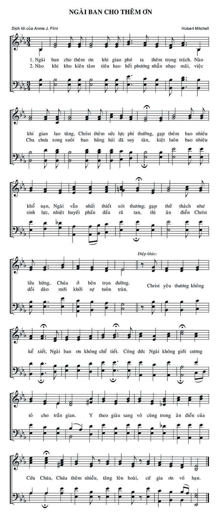 1. Ngài ban cho thêm ơn khi giao phó ta thêm trọng trách. Nào khi gian lao tăng, Christ thêm sức lực phi thường, gạp thêm bao nhiêu khổ nạn, Ngài vẫn nhất thiết xót thương; gạp thử thách như lửa hừng, Chúa ở bên trọn đường. 2. Nào khi kho kiên tâm tiêu hao hết phương nhẫn nhục mãi, việc Cha chưa xong xuôi bao hăng hái đã suy tàn, kiệt luôn bao nhiêu sinh lực, nhiệt huyết phấn đấu rã tan, thì ân điển Christ dồi dào mới khởi sự tuôn tràn. Điệp khúc: Christ yêu thương không kể xiết, Ngài ban ơn không chế tiết. Công đức Ngài không giới cương tỏ cho trần gian. Y theo giàu sang vô cùng trong ân điển của Cứu Chúa, Chúa thêm nhiều, tăng lên hoài, cứ gia ơn vô hạn.