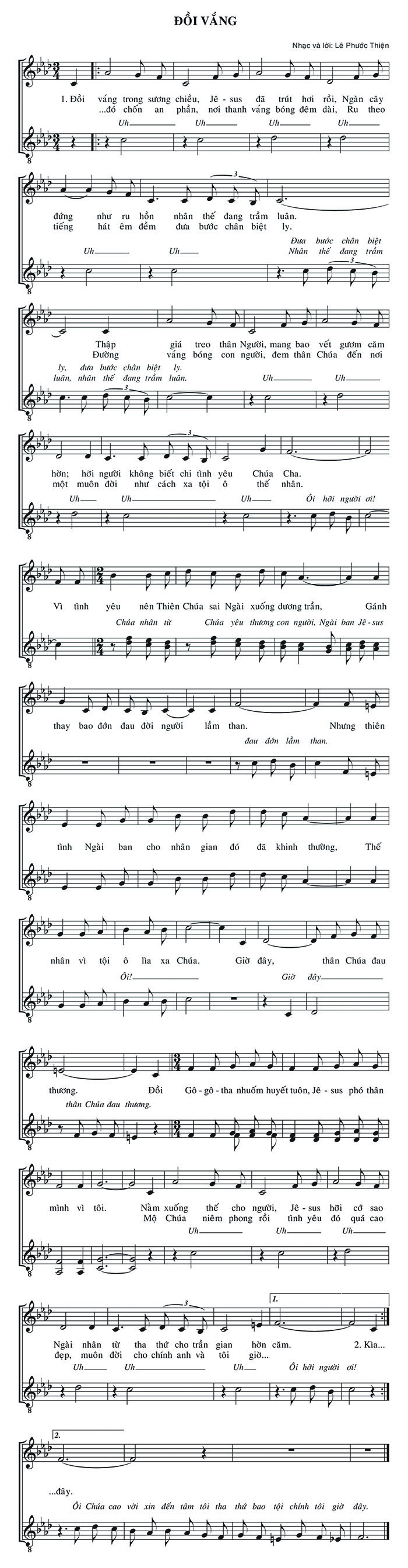 1. Đồi vắng trong sương chiều, Jêsus đã trút hơi rồi, Ngàn cây đứng như ru hồn nhân thế đang trầm luân. Thập giá treo thân Người, mang bao vết gươm căm hờn; hỡi người không biết chi tình yêu Chúa Cha. Vì tình yêu nên Thiên Chúa sai Ngài xuống dương trần, Gánh thay bao đớn đau đời người lầm than. Nhưng thiên tình Ngài ban cho nhân gian đó đã khinh thường, Thế nhân vì tội ô lìa xa Chúa. Giờ đây, thân Chúa đau thương. Đồi Gô-gô-tha nhuốm huyết tuôn, Jêsus phó thân mình vì tôi. Nằm xuống thế cho người, Jêsus hỡi cớ sao Ngài nhân từ tha thứ cho trần gian hờn căm. 2. ...đó chốn an phần, nơi thanh vắng bóng đêm dài, Ru theo tiếng hát êm đềm đưa bước chân biệt ly. Đường vắng bóng con người, đem thân Chúa đến nơi một muôn đời như cách xa tội ô thế nhân. Ôi hỡi người ơi! Chúa nhân từ Chúa yêu thương con người, Ngài ban Jê-sus đau đớn lầm than. Giờ đây thân Chúa đau thương. Mộ Chúa niêm phong rồi tình yêu đó quá cao đẹp, muôn đời cho chính anh và tôi giờ... Kìa... Ôi hỡi người ơi! Ôi Chúa cao vời xin đến tâm tôi tha thứ bao tội chính tôi giờ đây.
