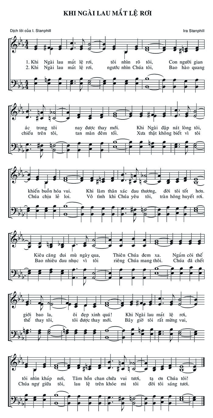 1. Khi Ngài lau mát lệ rơi, tôi nhìn rõ tôi, Con người gian ác trong tôi nay được thay mới. Khi Ngài đập nát lòng tôi, khiến buồn hóa vui. Khi làm thân xác đau thương, đời tôi tốt hơn. Kiêu căng đui mù ngày qua, Thiên Chúa đem xa. Ngám cõi thế giới bao la, ôi đẹp xinh quá! Khi Ngài lau mát lệ rơi, tôi nhìn khắp nơi, Tâm hồn chan chứa vui tươi, tạ ơn Chúa tôi! 2. Khi Ngài lau mát lệ rơi, ngước nhìn Chúa tôi, Bao hào quang chiếu trên tôi, tan màn đêm tối. Xưa thật không biết vì tôi Chúa chịu lẻ loi. Vô tình khi Chúa yêu tôi, tràn hông huyết rơi. Bao nhiêu đau nhục vì tôi riêng Chúa mang thôi. Chúa đã chết thế thay tôi, tôi được thay mới. Bây giờ tôi rất mừng vui, Chúa ngự giữa tôi, lau lệ trên khóe mi tôi đời tôi sáng tươi.