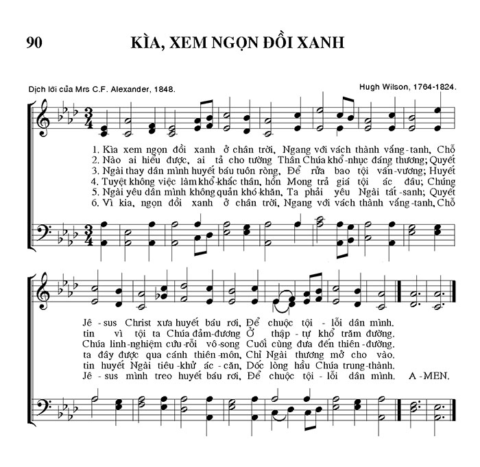 1. Kìa xem ngọn đồi xanh ở chân trời, Ngang với vách thành vắng - tanh, Chỗ tin vì tội ta Chúa đảm đương ở thập tự khổ trăm đường. 2. Nào ai hiểu được, ai tả cho tường Thần Chúa khổ nhục đáng thương; Quyết Chúa linh nghiệm cứu rỗi vô song Cuối cùng đưa đến thiên - đường. 3. Ngài thay dân mình huyết báu tuôn rồng, Để rửa bao tội vấn vương; Huyết ta đây được qua cánh thiên môn, Chỉ Ngài thương mở cho vào. 4. Tuyệt không việc làm khổ khắc thân, hồn Mong trả giá tội ác đâu; Chúng tin huyết Ngài tiêu khử ác - căn, Dốc lòng hầu Chúa trung thành. 5. Ngài yêu dẫn mình không quản khó khăn, Ta phải yêu Ngài tất -sanh; Quyết Jê-sus mình treo huyết báu rơi, Để chuộc tội lỗi dân mình. 6. Vì kia, ngọn đồi xanh ở chân trời, Ngang với vách thành vắng tanh, Chỗ Jê-sus Christ xưa huyết báu rơi, Để chuộc tội lỗi dân mình. Điệp khúc: Jê-sus Christ xưa huyết báu rơi, Để chuộc tội lỗi dân mình. A-MEN.