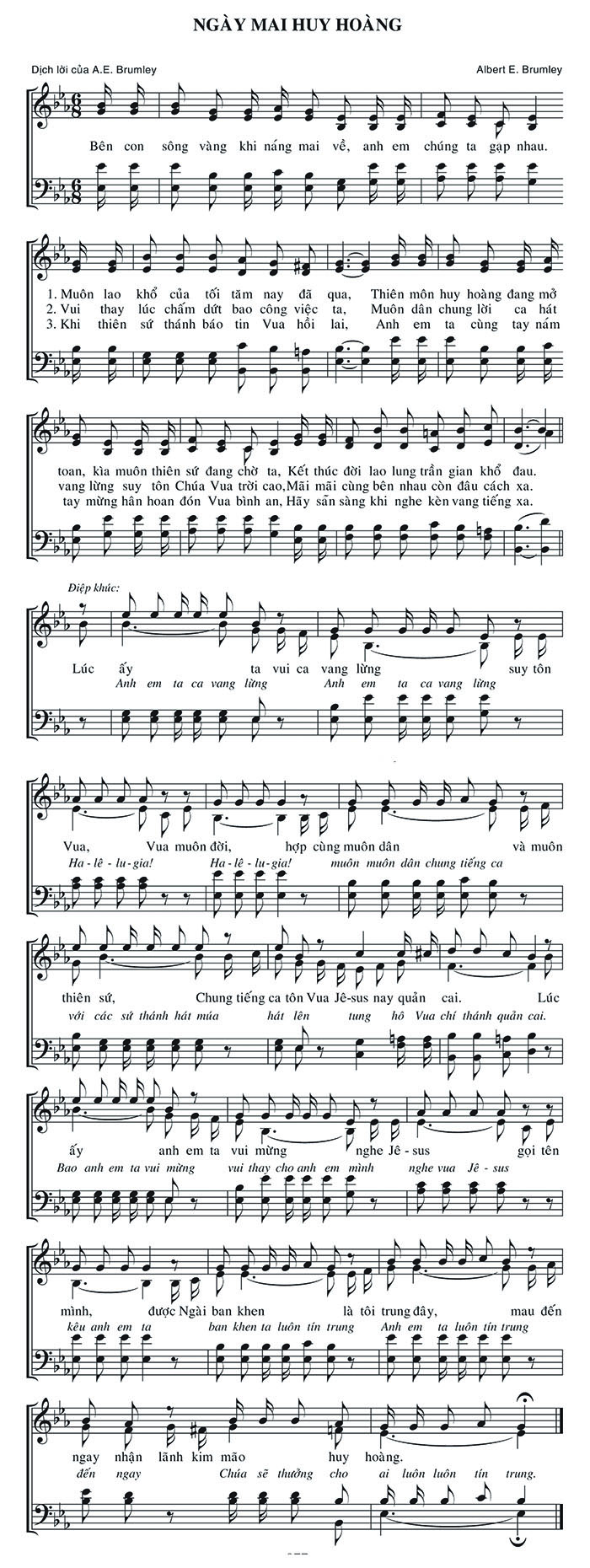 1. Bên con sông vàng khi náng mai về, anh em chúng ta gặp nhau. Muôn lao khổ của tối tăm nay đã qua, Thiên môn huy hoàng đang mở toan, kìa muôn thiên sứ đang chờ ta, Kết thúc đời lao lung trần gian khổ đau. 2. Bên con sông vàng khi náng mai về, anh em chúng ta gặp nhau. Vui thay lúc chấm dứt bao công việc ta, Muôn dân chung lời ca hát vang lừng suy tôn Chúa Vua trời cao, Mãi mãi cùng bên nhau còn đâu cách xa. 3. Bên con sông vàng khi náng mai về, anh em chúng ta gặp nhau. Khi thiên sứ thánh báo tin Vua hồi lai, Anh em ta cùng tay nắm tay mừng hân hoan đón Vua bình an, Hãy sẵn sàng khi nghe kèn vang tiếng xa. Điệp khúc: Lúc ấy anh em ta vui ca vang lừng suy tôn Vua, Vua muôn đời, hợp cùng muôn dân và muôn thiên sứ, Chung tiếng ca tôn Vua Jê-sus nay quản cai. Lúc ấy anh em ta vui mừng nghe Jê-sus gọi tên mình, được Ngài ban khen là tôi trung đây, ngay nhận lãnh kim mão huy hoàng. Ha-lê-lu-gia! Ha-lê-lu-gia! muôn muôn dân chung tiếng ca với các sứ thánh hát múa hát lên tung hô Vua chí thánh quản cai. Bao anh em ta vui mừng vui thay cho anh em mình nghe vua Jê-sus kêu anh em ta ban khen ta luôn tín trung Anh em ta luôn tín trung mau đến đến ngay Chúa sẽ thưởng cho ai luôn luôn tín trung.