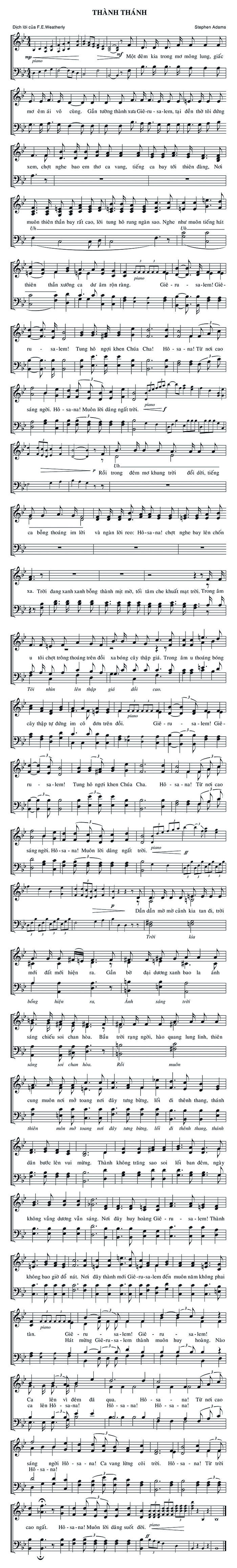 1. Một đêm kia trong mơ mông lung, giấc mơ êm ái vô cùng. Gần tường thành xưa Giê-ru-sa-lem, tại đền thờ tôi đứng xem, chợt nghe bao em thơ ca vang, tiếng ca bay tới thiên đàng. Nơi muôn thiên thần bay rất cao, lời tung hô rung ngàn sao. Nghe như muôn tiếng hát thiên thần xướng ca dư âm rộn ràng. Giê-ru-sa-lem! Giê-ru-sa-lem! Tung hô ngợi khen Chúa Cha! Hô-sa-na! Từ nơi cao sáng ngời. Hô-sa-na! Muôn lời dâng ngất trời. 2. Rồi trong đêm mơ khung trời đổi dời, tiếng ca bỗng thoáng im lời và ngàn lời reo: Hô-sa-na! chợt nghe bay lên chốn xa. Trời đang xanh xanh bỗng thành mịt mờ, tối tăm che khuất mặt trời. Trong âm u tôi chợt trông thoáng trên đồi xa bóng cây thập giá. Trong âm u thoáng bóng cây thập tự đứng im cô đơn trên đồi. Giê-ru-sa-lem! Giê-ru-sa-lem! Tung hô ngợi khen Chúa Cha! Hô-sa-na! Từ nơi cao sáng ngời. Hô-sa-na! Muôn lời dâng ngất trời. 3. Dần dần mờ mờ cảnh kia tan đi, trời mới đất mới hiện ra. Gần bờ đại dương xanh bao la ánh sáng chiếu soi chan hòa. Bầu trời rạng ngời, hào quang lung linh, thiên cung muôn nơi mở toang nơi đây tưng bừng, lối đi thênh thang, thánh dân bước lên vui mừng. Thành không trăng sao soi lối ban đêm, ngày không vầng dương vẫn sáng. Nơi đây huy hoàng Giê-ru-sa-lem! Thành không bao giờ đổ nát. Nơi đây thành mới Giê-ru-sa-lem đến muôn năm không phai tàn. Giê-ru-sa-lem! Giê-ru-sa-lem! Hát mừng Giê-ru-sa-lem thành muôn huy hoàng. Nào ca lên vì đêm đi qua. Hô-sa-na! Từ nơi cao sáng ngời Hô-sa-na! Ca vang lừng cõi trời. Hô-sa-na! Từ trời cao ngất. Hô-sa-na! Muôn lời dâng suốt đời.