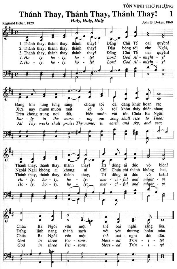 1. Thánh thay, thánh thay, thánh thay! Đang khi tưng tưng sáng, chúng tôi đã dâng khúc hoan ca; Thánh thay, thánh thay, thánh thay! Chúa Ba Ngôi vốn một thể oai nghi, rạng lòa. 2. Thánh thay, thánh thay, thánh thay! Xưa nay muôn muôn mắt kẻ ô tội khôn thấy thiên-nhan; Ngoài Ngài không ai không ai Chỉ Chúa chí thánh không hai, Đấng linh năng thánh sạch với yêu thương hoàn toàn. 3. Thánh thay, thánh thay, thánh thay! Trên không trung nơi đất, biển muôn vật tôn Chúa Ba Ngôi; Thánh thay, thánh thay, thánh thay, Chúa Ba Ngôi vốn một thể oai nghi đời đời.