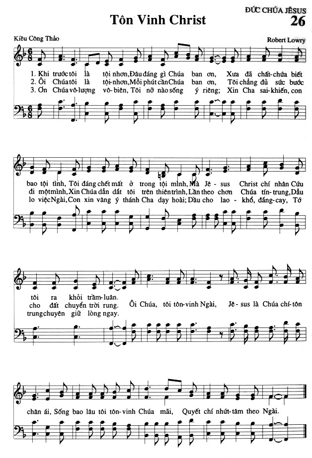 1. Khi trước tôi là tội nhơn, Đâu đáng gì Chúa ban ơn, Xưa đã chất-chứa biết bao tội tình, Tôi đáng chết mất ở trong tội mình, Mà Jê-sus Christ chí nhân Cứu tôi ra khỏi trầm luân. 2. Ôi Chúa tôi là tội nhơn, Mỗi phút cần Chúa ban ơn, Tôi chẳng đủ sức bước đi một mình, Xin Chúa dẫn dắt tôi trên thiêntrình, Lần theo chơn Chúa tín-trung, Dẫu cho đất chuyển trời rung. 3. Ơn Chúa vô lượng vô biên, Tôi nỡ nào sống ý riêng; Xin Cha sai-khiến, con lo việc Ngài, Con xin vâng ý thánh Cha dạy hoài; Dầu cho lao - khổ, đắng-cay, Tớ trungchuyên giữ lòng ngay. Điệp khúc: Ôi Chúa, tôi tôn vinh Ngài, Jê-sus là Chúa chí-tôn chân ái, Sống bao lâu tôi tôn vinh Chúa mãi, Quyết chí nhứt tâm theo Ngài.