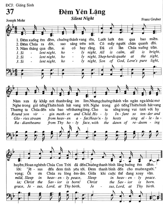 1. Đêm xuống êm đềm, chuông thánh vang rền, Lướt lướt êm qua bao miền. Năm xưa ấy khắp nơi thanhvắng im lìm. Nhưng chuông thánh vẫn ngân nga khúc mơ huyền; Hoan nghênh Chúa Con Trời đã đến Chuông thanh bình láng buông êm đềm. lời: "Je sus đến đem tình yêu tới. Đem thanh bình đến cho muôn người." mild, Sleep in heaven-ly peace, Sleep in heaven-ly peace. 2. Đêm Chúa ra đời, sao sáng trên trời. Có mấy người chăn quanh đồi. Nghe trong gió tiếng Thiên binh hát vang trời. Nghe trong gió tiếng Thiên binh hát vang Thương ta Chúa đến xóa bao vết thương lòng. Cho ta sống trong vui tươi với hy vọng; Ôi ơn Chúa ru lòng êm ấm. Giữa khi cuộc thế đang xoay vần. ia; Christ the Savior is born! Christ the Savior is born. 3. Năm tháng qua dần, ai có hay rằng. Đã có lần Chúa xuống trần. Round yon virgin mother and Child. Holy Infant so tender and Glo-ries stream from heav-en a-far, Heav'n-ly hosts sing al-le-lu-Ra-diantbeams from Thy ho-ly face, with the dawn of re-deem-ing grace, Je-sus, Lord, at Thy birth, Je-sus, Lord, at Thy birth.