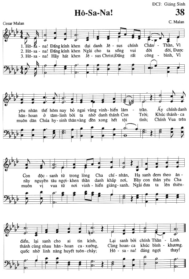1. Hô-sa-na! Đấng kính khen đại danh Jê-sus chính Chân-Thần, Vì yêu nhân thế hôm nay bỏ ngai vàng vinh-hiển lâm trần. Ấy chính danh Con độc-sanh từ trong lòng Cha chí-nhân, Hạ sanh đem theo ân-điển, lại sanh cho ai tin kính, Lại sanh bởi chính Thần Linh. 2. Hô-sa-na! Đấng kính khen Ngài cho ta sống vui đời đời, Được hân-hoan ở tâm-linh bởi ta nhờ danh thánh Con Trời; Khúc thánh-ca này nguyền tâu ngợi-khen thần danh khắp nơi, Bầy con thân yêu Cha thánh cùng nhau hân-hoan ca-xướng, Cùng hoan-ca khúc bình-khương. 3. Hô-sa-na! Hãy hát khen Jê-sus Christ, Đấng rất công-bình, Vì muôn dân Chúa hy-sinh thân vàng đền xong hết tội tình; Chính Vua trên muôn vị vua từ nơi vinh-hiển giáng-sanh. Ngài đưa ta lên thiên-quốc nhờ linh năng huyết tuôn-chảy; Hô-sa-na! đáng ngợi thay!