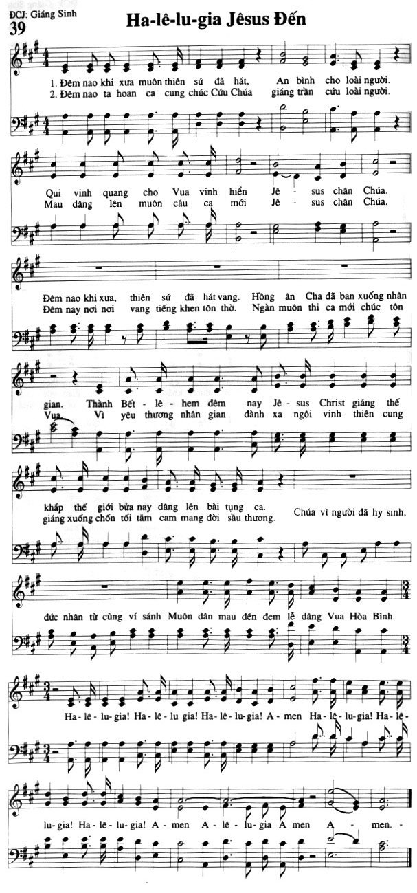 1. Đêm nao khi xưa muôn thiên sứ đã hát, An bình cho loài người. Qui vinh quang cho Vua vinh hiển Jê-sus chân Chúa. Đêm nao khi xưa, thiên sứ đã hát vang. Hồng ân Cha đã ban xuống nhân gian. Thành Bết-lê-hem đêm nay Jê-sus Christ giáng thế khắp thế giới bửa nay dâng lên bài tụng ca. đức nhân từ cùng ví sánh Muôn dân mau đến đem lễ dâng Vua Hòa Bình. 2. Đêm nao ta hoan ca cung chúc Cứu Chúa giáng trần cứu loài người. Mau dâng lên muôn câu ca mới Jê-sus chân Chúa. Đêm nay nơi nơi vang tiếng khen tôn thờ. Ngàn muôn thi ca mới chúc tôn Vua. Vì yêu thương nhân gian đành xa ngôi vinh thiên cung giáng xuống chốn tối tăm cam mang đời sầu thương. Chúa vì người đã hy sinh, đức nhân từ cùng ví sánh Muôn dân mau đến đem lễ dâng Vua Hòa Bình. Điệp khúc: Ha-lê-lu-gia! Ha-lê-lu gia! Ha-lê-lu-gia! A-men Ha-lê-lu-gia! Ha-lê-lu-gia! Ha-lê-lu-gia! A-men A-lê-lu-gia A-men men.
