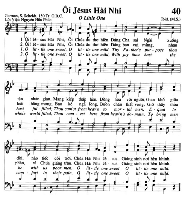 1. Ôi! Jê-sus Hài Nhi, Ôi Chúa ấu thơ hiền. Đấng Cha sai Ngài xuống tận nhân gian, Mang kiếp thấp hèn, Đồng hóa với người, Gian khổ giữa đời, nào tiếc cõi trời. Chúa Hài Nhi Jê-sus, Giáng sinh nơi hèn khinh. 2. Ôi! Jê-sus Hài Nhi, Ôi Chúa ấu thơ hiền. Đấng ban vui mừng, nhân loại hàng mong, Bao kẻ ngã lòng, Buồn chán thất vọng, Giờ thấy thỏa phần, vì Chúa giáng trần. Chúa Hài Nhi Jê-sus, Giáng sinh nơi hèn khinh.