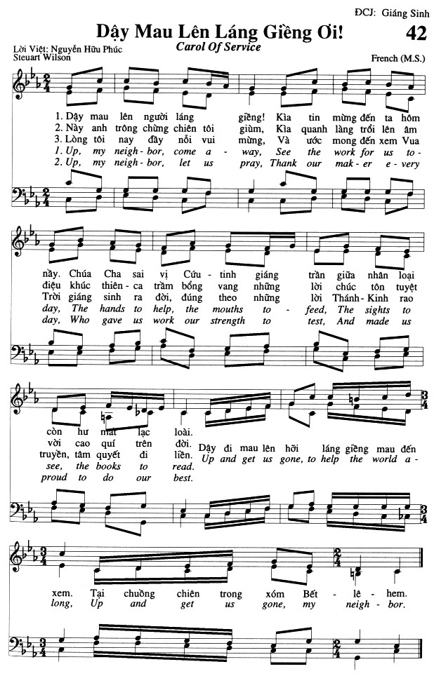1. Dậy mau lên người láng giềng! Kìa tin mừng đến ta hôm nay. Chúa Cha sai vị Cứu tinh giáng trần giữa nhân loại còn hư mất lạc loài. Dậy đi mau lên hỡi láng giềng mau đến xem. Tại chuồng chiên trong xóm Bết lê hem. 2. Này anh trông chừng chiên tôi giùm, Kìa quanh làng trổi lên âm điệu khúc thiên ca trầm bổng vang những lời chúc tôn tuyệt vời cao quí trên đời. Dậy đi mau lên hỡi láng giềng mau đến xem. Tại chuồng chiên trong xóm Bết lê hem. 3. Lòng tôi nay đầy nỗi vui mừng, Và ước mong đến xem Vua Trời giáng sinh ra đời, đúng theo những lời Thánh - Kinh rao truyền, tâm quyết đi liền. Dậy đi mau lên hỡi láng giềng mau đến xem. Tại chuồng chiên trong xóm Bết lê hem.