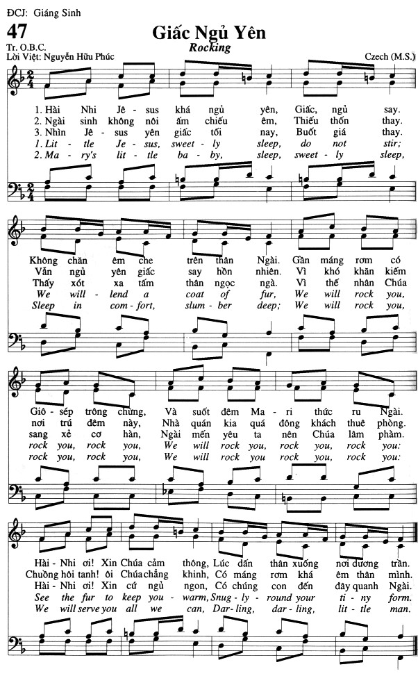 1. Hài Nhi Je-sus khá ngủ yên, Giấc, ngủ say. Không chăn êm che trên thân Ngài. Gần máng rơm có nhiên. Giô-sép trông chừng, Và suốt đêm Ma-ri thức ru Ngài. Hài-Nhi ơi! Xin Chúa cảm thông, Lúc dấn thân xuống nơi dương trần. 2. Ngài sinh không nôi ấm chiếu êm, Thiếu thốn thay. Vẫn ngủ yên giấc say hồn ngà. Vì khó khăn kiếm Chúa. nơi trú đêm này, Nhà quán kia quá đông khách thuê phòng. Chuồng hôi tanh! ôi Chúa chẳng khinh, Có máng rơm khá êm thân mình. 3. Nhìn Je-sus yên giấc tối nay, Buốt giá thay. Thấy xót xa tấm thân ngọc ngà. Vì thế nhân Chúa. sang xẻ cơ hàn, Ngài mến yêu ta nên Chúa lâm phàm. Hài-Nhi ơi! Xin cứ ngủ ngon, Có chúng con đến đây quanh Ngài.