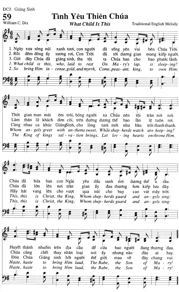 1. Ngày xưa sông núi xanh tươi, con người đã sống yên vui bên Chúa Trời. Thời gian man mát êm trôi, bóng người xa Chúa nên tội tràn nơi nơi. Chúa đã hứa ban con Ngài yêu dấu sanh nơi dương thế u sầu. Huyết thánh nhuốm trên địa cầu để cứu bao người đang thương đau. 2. Rồi đêm đông ấy sương rơi, Con Trời đã tới dương gian mang kiếp người. Làm thân lữ khách đơn côi, trên đường dương thế bao lệ tuôn rơi. Chúa đã lớn lên nơi trần gian ấy đau thương hơn kiếp lưu đày. Chúa cũng chết thay nhân loại nơi ấy nhưng nào đâu ai hay. 3. Giờ đây Chúa đã giáng sinh, tha tội ta Chúa ban cho bao phước lành. Cùng nhau ca khúc Giáng Sinh, cho lòng tươi mới như bầu trời thanh thanh. Hãy hát vang lên cho vượt qua núi cho bay cao vút mây trời. Đón Chúa Giáng sinh hỡi người thế giới mau về đây chung vui.