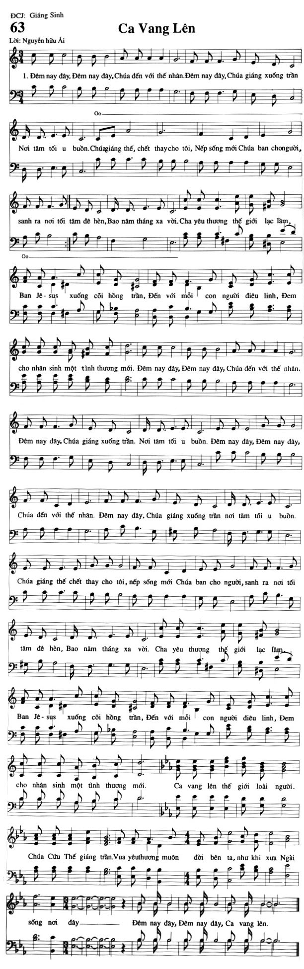 1. Đêm nay đây, Đêm nay đây, Chúa đến với thế nhân. Đêm nay đây, Chúa giáng xuống trần Nơi tăm tối u buồn. Chúa giáng thế, chết thay cho tôi, Nếp sống mới Chúa ban cho người, sanh ra nơi tối tăm đê hèn, Bao năm tháng xa vời. Cha yêu thương thế giới lạc lầm, Ban Jê-sus xuống cõi hồng trần, Đến với mỗi con người điêu linh, Đem cho nhân sinh một tình thương mới. Điệp khúc: Đêm nay đây, Đêm nay đây, Chúa đến với thế nhân. Đêm nay đây, Chúa giáng xuống trần. Nơi tăm tối u buồn. Đêm nay đây, Đêm nay đây, Chúa đến với thế nhân. Đêm nay đây, Chúa giáng xuống trần nơi tăm tối u buồn. Chúa giáng thế chết thay cho tôi, nếp sống mới Chúa ban cho người, sanh ra nơi tối tăm đê hèn, Bao năm tháng xa vời. Cha yêu thương thế giới lạc lầm, Ban Jesus xuống cõi hồng trần, Đến với mỗi con người điêu linh, Đem cho nhân sinh một tình thương mới. Ca vang lên thế giới loài người. Chúa Cứu Thế giáng trần. Vua yêu thương muôn đời bên ta, như khi xưa Ngài sống nơi đây. Đêm nay đây, Đêm nay đây, Ca vang lên.