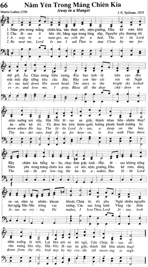 1. Nằm yên trong máng chiên kia, nào được nôi, nệm giường, Đầu kê rơm khô thế gối, Ấu Chúa trông hiền lương, Kìa bao tinh tú trên cao đều nhìn xuống nơi này, Hài Nhi Jêsus an giấc, thánh nhan hồn nhiên thay! Bầy chiên kia bống be - be, chọc thức giấc Anh - Hài, Jêsus không tiếng oe - oe, nằm tự nhiên - khoan khoái, Chúa ôi, tôi yêu Ngài nhiều nguyền nhìn xuống từ trời, Lại bên nôi ru tôi ngủ, Cứu Chúa Jêsus ơi! 2. Cầu Jêsus ở bên tôi, hằng ngự trong lòng này, Nguyền yêu thương tôi mãi mãi đáp tiếng kêu cầu đây; Bầy con thơ củi xin ơn Ngài âu yếm hộ trì, Và đem lên trên thiên-quốc hưởng phước hanh trường hỉ; Nằm yên trong máng chiên kia nào có nôi, nệm, giường, Đầu kê rơm, dáng thơ ngây Hài Nhi trông vui sướng; Các sao long lanh Vằng vặc dòm vào máng hèn này, Hài Nhi Jêsus an giấc, thánh thể hồn nhiên thay! 3. A way in a man-ger, no crib for a bed, The little Lord Jesus laid down His sweet head; The stars in the bright sky looked down where He lay, The little Lord Jesus, a sleep on the hay. Be near me, Lord Jesus I ask Thee to stay Close by me for-ev-er, and love me, I pray. Bless all the dear chil - dren in Thy tender care, And fit us for heaven, to live with Thee there. The cat-tle are low-ing, the ba-by a-wakes, But little Lord Jesus no cry - ing He makes, I love Thee, Lord Je - sus, look down from the sky, And stay by my cra-dle till morn-ing is nigh.