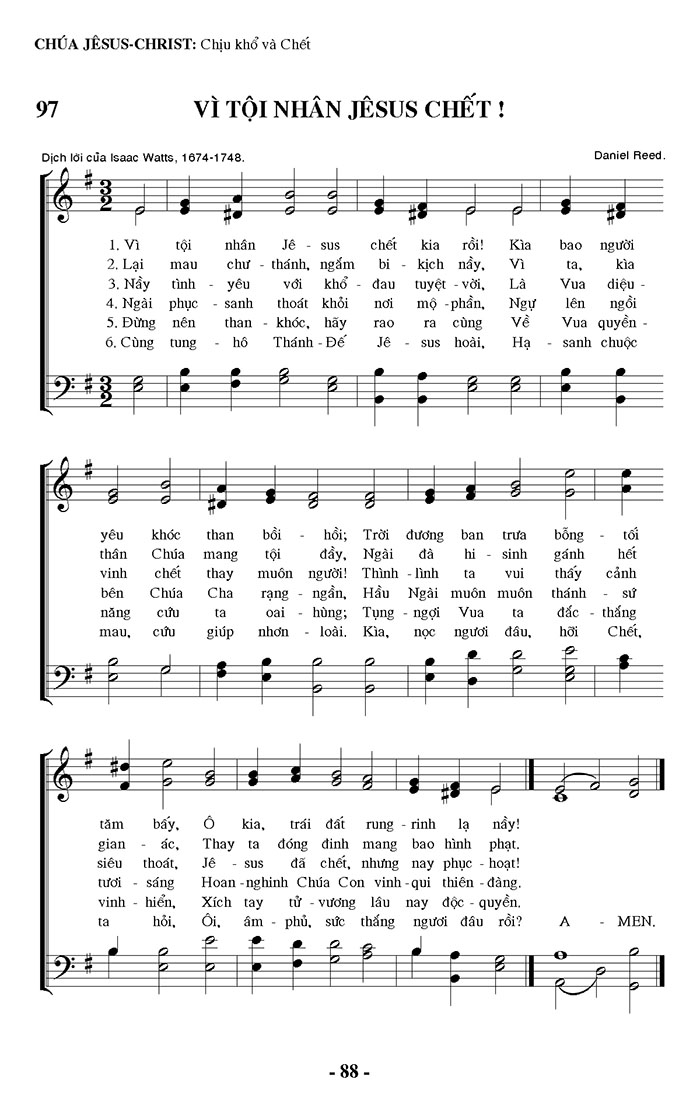 1. Vì tội nhân Jêsus chết kia rồi! Kìa bao người yêu khóc than bồi hồi; Trời đương ban trưa bỗng tối tăm bấy, Ô kia, trái đất rung rinh lạ nầy! 2. Lại mau chư thánh, ngắm bi kịch nầy, Vì ta, kìa thân Chúa mang tội đầy, Ngài đà hi sinh gánh hết gian ác, Thay ta đóng đinh mang bao hình phạt. 3. Nầy tình yêu với khổ đau tuyệt vời, Là Vua diệu vinh chết thay muôn người! Thình lình ta vui thấy cảnh siêu thoát, Jêsus đã chết, nhưng nay phục hoạt! 4. Ngài phục sanh thoát khỏi nơi mộ phần, Ngự lên ngồi bên Chúa Cha rạng ngần, Hầu Ngài muôn muốn thánh sứ tươi sáng Hoan-nghinh Chúa Con vinh-qui thiên đàng. 5. Đừng nên than khóc, hãy rao ra cùng Về Vua quyền năng cứu ta oai hùng; Tụng ngợi Vua ta đắc thắng vinh hiển, Xích tay tử vương lâu nay độc quyền. 6. Cùng tung hô Thánh Đế Jêsus hoài, Hạ sanh chuộc mau, cứu giúp nhơn loài. Kìa, nọc ngươi đâu, hỡi Chết, Ôi, âm phủ, sức thắng ngươi đâu rồi? A MEN.