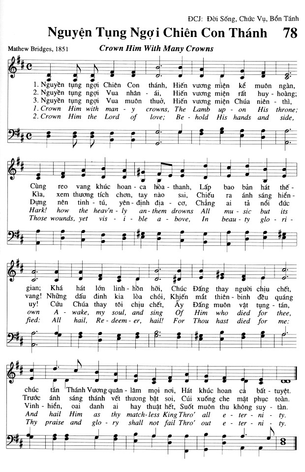 1. Nguyện tụng ngợi Chiên Con thánh, Hiến vương miện kể muôn ngàn, Cùng reo vang khúc hoan ca hòa thanh, Lấp bao bản hát thế gian; Khá hát lớn linh hồn hỡi, Chúc Đấng thay người chịu chết, Chúc tán Thánh Vương quân lâm mọi nơi, Hát khúc hoan ca bất tuyệt. 2. Nguyện tụng ngợi Vua nhân ái, Hiến vương miện rất huy hoàng; Kìa, xem thương tích chơn, tay nào sai, Chiếu ra ánh sáng hiển vang! Những dấu đinh kia lòa chói, Khiến mất thiên binh đều quáng uy! Trước ánh sáng thánh vết thương bật soi, Cúi xuống che mặt phục toàn. 3. Nguyện tụng ngợi Vua muôn thuở, Hiến vương miện Chúa niên thì, Dựng nên tinh tú, yên định địa cơ, Chẳng ai tả nổi đức uy! Cứu Chúa thay tôi chịu chết, Ấy Đấng muôn vật tụng tán, Vinh hiển, oai danh ai hay thuật hết, Suốt muôn thu không suy tàn.