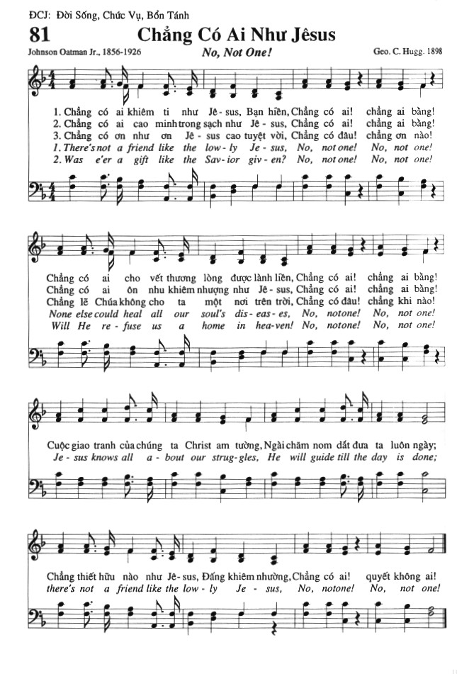 1. Chẳng có ai khiêm ti như Jê-sus, Bạn hiền, Chẳng có ai! chẳng ai bằng! There's not a friend like the low-ly Je-sus, No, not one! Chẳng có ai cho vết thương lòng được lành liền, Chẳng có ai! chẳng ai bằng! None else could heal all our soul's dis-eas-es, No, notone! Cuộc giao tranh của chúng ta Christ am tường, Ngài chăm nom dắt đưa ta luôn ngày; Jesus knows all a-bout our strug-gles, He will guide till the day is done; Chẳng thiết hữu nào như Jê-sus, Đấng khiêm nhường, Chẳng có ai! quyết không ai! there's not a friend like the low-ly Je-sus, No, notone! No, not one! 2. Chẳng có ai cao minh trong sạch như Jê-sus, Chẳng có ai! chẳng ai bằng! Was e'er a gift like the Sav-ior giv-en? No, not one! Chẳng có ai ôn nhu khiêm nhượng như Jê-sus, Chẳng có ai! chẳng ai bằng! None else could heal all our soul's dis-eas-es, No, notone! Cuộc giao tranh của chúng ta Christ am tường, Ngài chăm nom dắt đưa ta luôn ngày; Jesus knows all a-bout our strug-gles, He will guide till the day is done; Chẳng thiết hữu nào như Jê-sus, Đấng khiêm nhường, Chẳng có ai! quyết không ai! there's not a friend like the low-ly Je-sus, No, notone! No, not one! 3. Chẳng có ơn như ơn Jê-sus cao tuyệt vời, Chẳng có đâu! chẳng ơn nào! There's not a friend like the low-ly Je-sus, No, not one! Chẳng lẽ Chúa không cho ta một nơi trên trời, Chẳng có đâu! chẳng khi nào! Will He re-fuse us a home in hea-ven! No, notone! Cuộc giao tranh của chúng ta Christ am tường, Ngài chăm nom dắt đưa ta luôn ngày; Jesus knows all a-bout our strug-gles, He will guide till the day is done; Chẳng thiết hữu nào như Jê-sus, Đấng khiêm nhường, Chẳng có ai! quyết không ai! there's not a friend like the low-ly Je-sus, No, notone! No, not one!