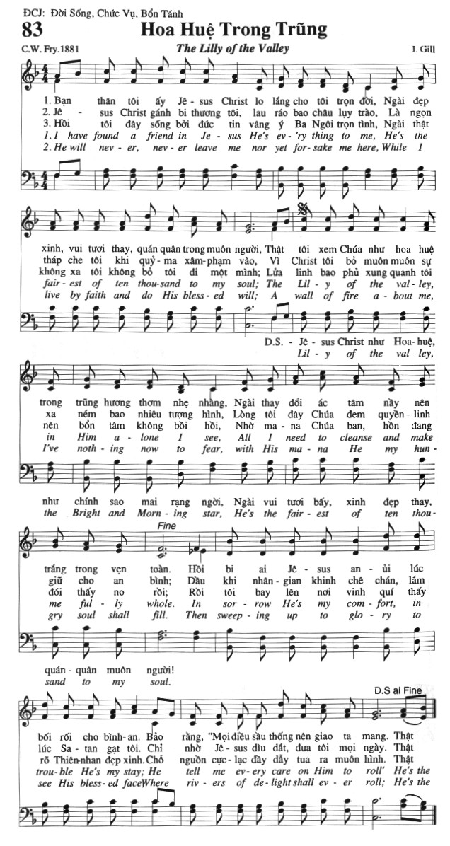 1. Bạn thân tôi ấy Jesus Christ lo lắng cho tôi trọn đời, Ngài đẹp xinh, vui tươi thay, quán quân trong muôn người, Thật tôi xem Chúa như hoa huệ trong trũng hương thơm nhẹ nhàng, Ngài thay đổi ác tâm này nên trắng trong vẹn toàn. Hồi bi ai Jesus an ủi lúc bối rối cho bình-an. Bảo rằng, "Mọi điều sầu thống nên giao ta mang. Thật 2. Jesus Christ gánh bị thương tôi, lau ráo bao châu lụy trào, Là ngọn tháp che tôi khi quỷ-ma xâm phạm vào, Vì Christ tôi bỏ muôn muôn sự xa ném bao nhiêu tượng hình, Lòng tôi đây Chúa đem quyền-linh giữ cho an bình; Dầu khi nhân gian khinh chê chán, lắm lúc Sa tan gạt tôi. Chỉ nhờ Jesus dìu dắt, đưa tôi mọi ngày. Thật 3. Hồi tôi đây sống bởi đức tin vâng ý Ba Ngôi trọn tình, Ngài thật không xa tôi không bỏ tôi đi một mình; Lửa linh bao phủ xung quanh tôi nên bổn tâm không bồi hồi, Nhờ ma na Chúa ban, hồn đang đói thấy no rồi; Rồi tôi bay lên nơi vinh quí thấy rõ Thiên-nhan đẹp xinh. Chỗ nguồn cực-lạc đầy dẫy tua ra muôn hình. Thật Điệp khúc: Jesus Christ như Hoa huệ, Lily of the valley, như chính sao mai rạng ngời, Ngài vui tươi bấy, xinh đẹp thay, quán quân muôn người!