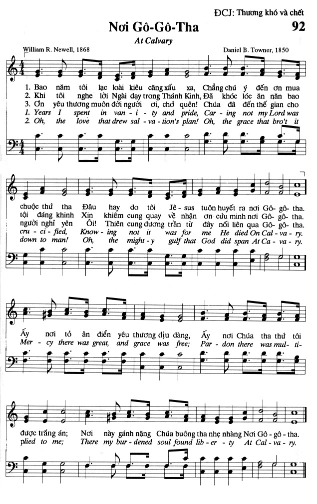 1. Bao năm tôi lạc loài kiêu căng xấu xa, Chẳng chú ý đến ơn mua chuộc thứ tha. Đâu hay do tôi Jê-sus tuôn huyết ra nơi Gô-gô-tha. Years I spent in van-i-ty and pride, Car-ing not my Lord was cru-ci-fied, Know-ing not it was for me He died On Cal-va-ry. 2. Khi tôi nghe lời Ngài dạy trong Thánh Kinh, Đã khóc lóc ăn năn bao tội đáng khinh. Xin khiêm cung quay về nhận ơn cứu minh nơi Gô-gô-tha. Oh, the love that drew sal-va-tion's plan! Oh, the grace that bro't it down to man! Oh, the might-y gulf that God did span At Ca-va-ry. 3. Ơn yêu thương muôn đời người ơi, chớ quên! Chúa đã đến thế gian cho người nghỉ yên. Ôi! Thiên cung dương trần từ đây nối liên qua Gô-gô-tha. Điệp khúc: Ấy nơi tỏ ân điển yêu thương dịu dàng, Ấy nơi Chúa tha thứ tôi được trắng án; Nơi này gánh nặng Chúa buông tha nhẹ nhàng Nơi Gô-gô-tha. Mer-cy there was great, and grace was free; Par-don there was mul-ti-plied to me; There my bur-dened soul found lib-er-ty At Cal-va-ry.